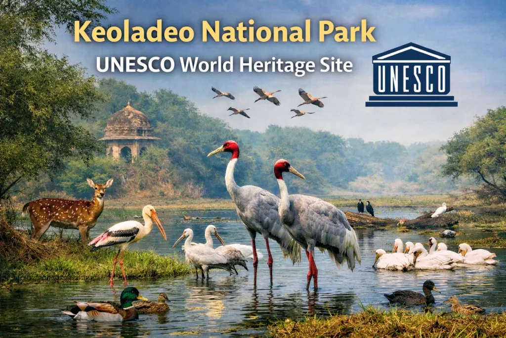 keoladeo national park unesco status भारत की प्राकृतिक धरोहर और जैव विविधता की अंतरराष्ट्रीय पहचान का एक महत्वपूर्ण उदाहरण है। राजस्थान के भरतपुर जिले में स्थित Keoladeo National Park न केवल भारत बल्कि पूरी दुनिया में पक्षी प्रेमियों और प्रकृति शोधकर्ताओं के लिए एक विशेष स्थान रखता है। यह लेख आपको सरल हिंदी में बताएगा कि केवलादेव राष्ट्रीय उद्यान को यूनेस्को विश्व धरोहर का दर्जा क्यों मिला, इसका इतिहास क्या है, और यह दर्जा भारत के लिए क्यों इतना महत्वपूर्ण है।